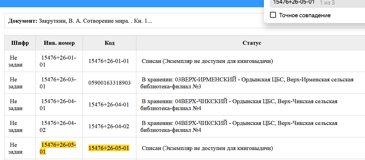 Экземпляр 15476+26-05-01 списан в каталоге! Уберите подполе 899$w в экземпляре, тогда спишется. У 65306+26-05-01 экземпляра - изменен номер штрихкода, верните 65306+26-05-01, спишите с читателя, потом снова запишите штрихкод в 899$p. |