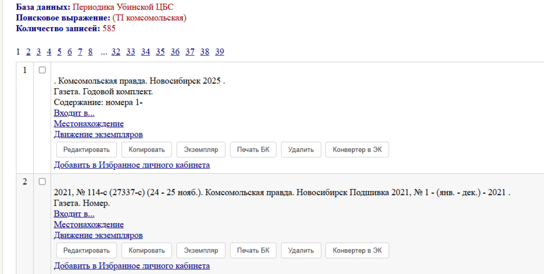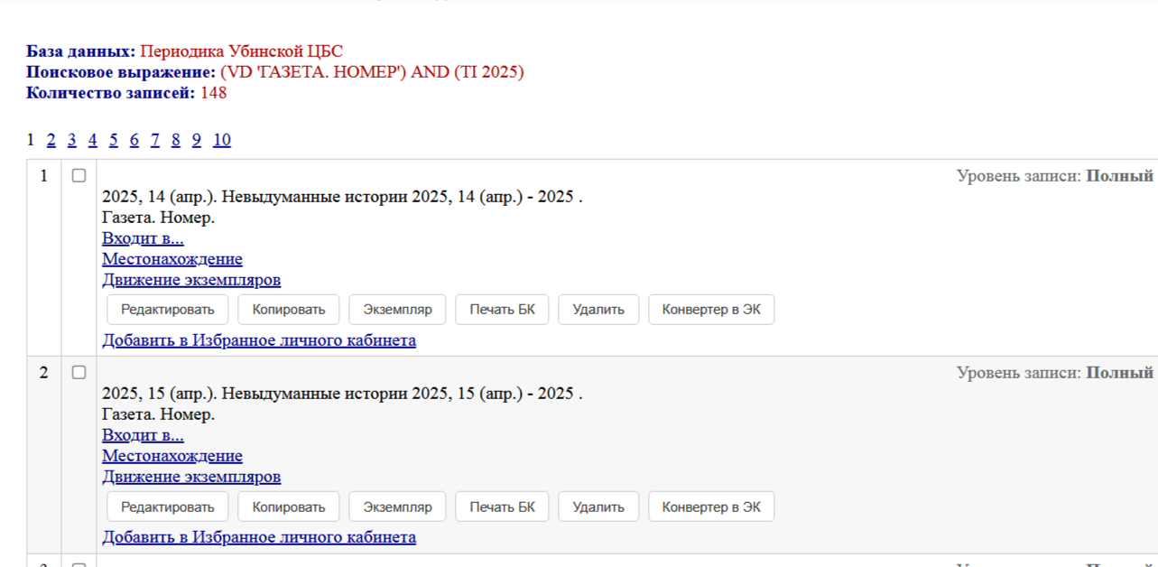 Начиная с 2025 года, все газеты оформляем годовым комплектом. У вас в базе нашлись номера за 2025 год, см. картинку. Поисковое выражение: База данных: Периодика Убинской ЦБС Поисковое выражение: (VD 'ГАЗЕТА. НОМЕР') AND (TI 2025) Количество записей: 148 |