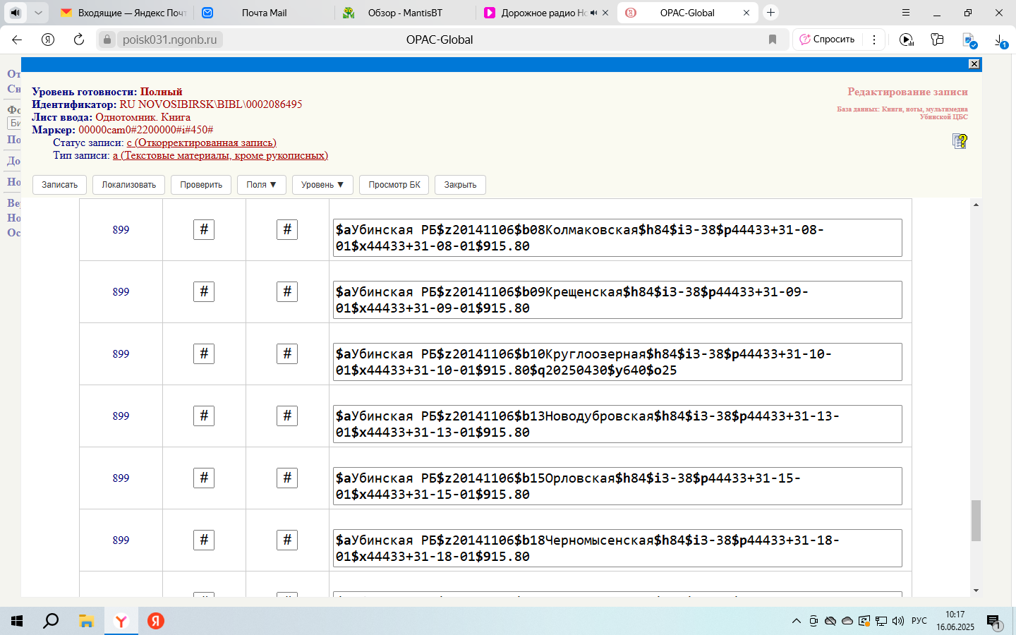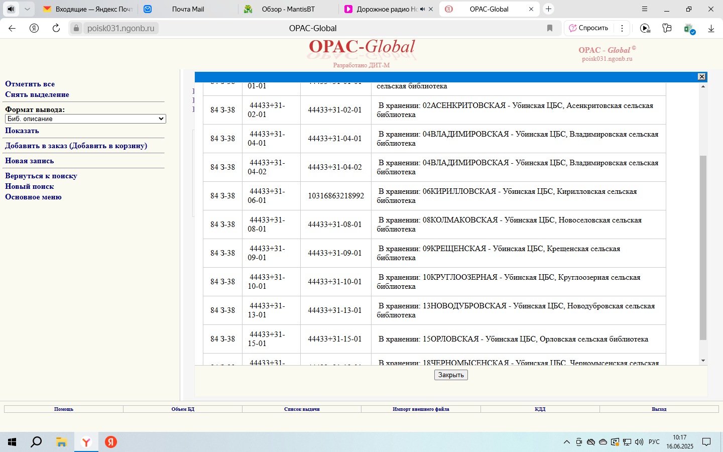 | 0000281 | Вопросы по АБИС Opac-Global НСО | Проблема | public | 2025-06-16 03:31 | 2025-07-08 06:05 |