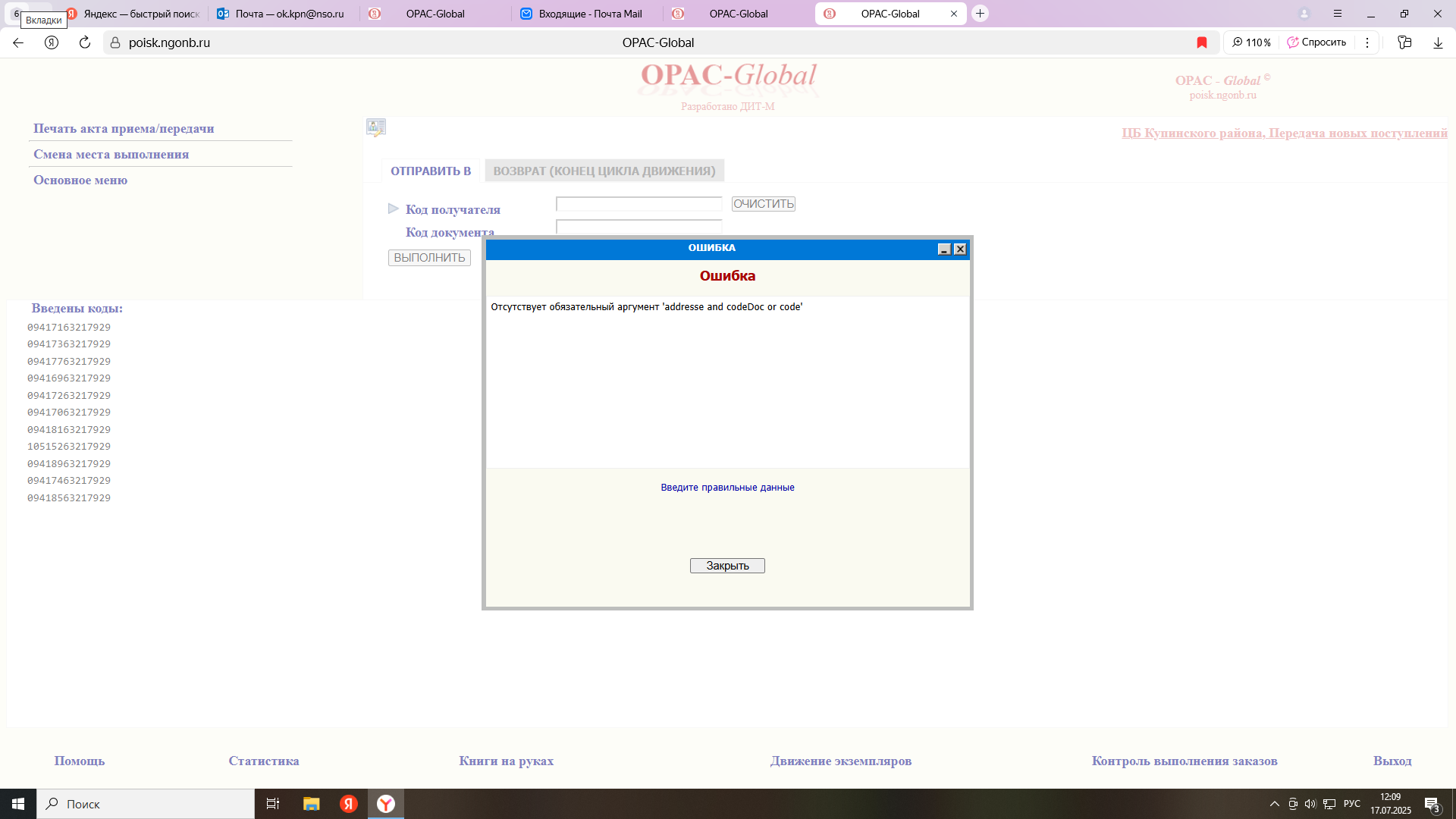 | Description | Добрый день! При передаче в : Новосельская СБ, Взрослый абонемент Новосельская СБ, Детский абонемент Советская СБ, Взрослый абонемент Советская СБ, Детский абонемент Мальковская СБ, Взрослый абонемент Мальковская СБ, Детский абонемент при нажатии ВЫПОЛНИТЬ выдает ошибку В другие библиотеки все успешно передали | ||||