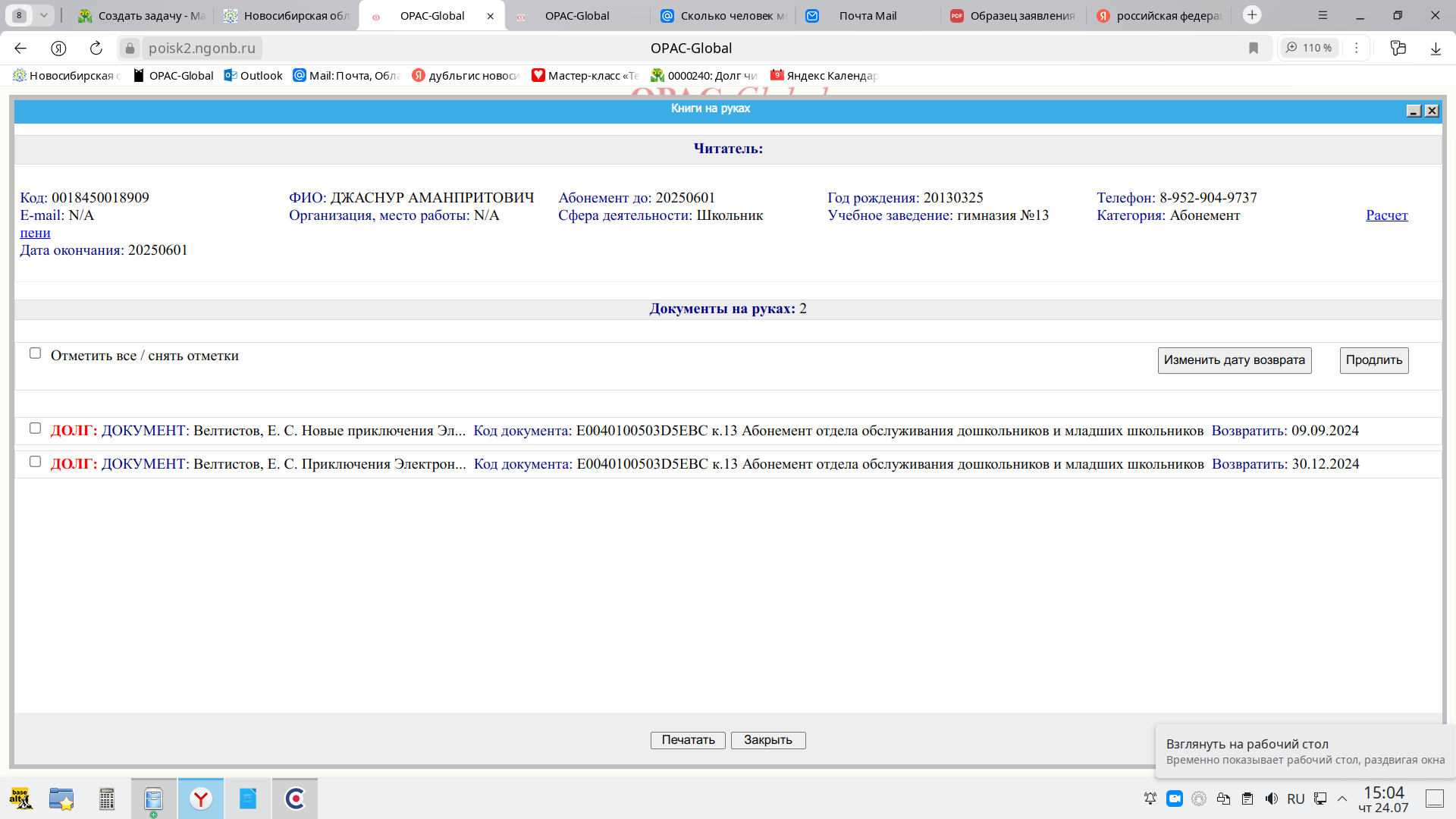 Штрихкод читателя и номер книги предоставьте, пожалуйста, цифрами, чтобы мне можно было их скопировать.