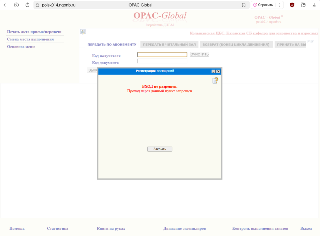 DescriptionРегистрация посещений пунктов Колыванская ЦБС Казанская Д и Колыванская ЦБС, Казанская СБ кафедра для юношества и взрослых не выполняется.