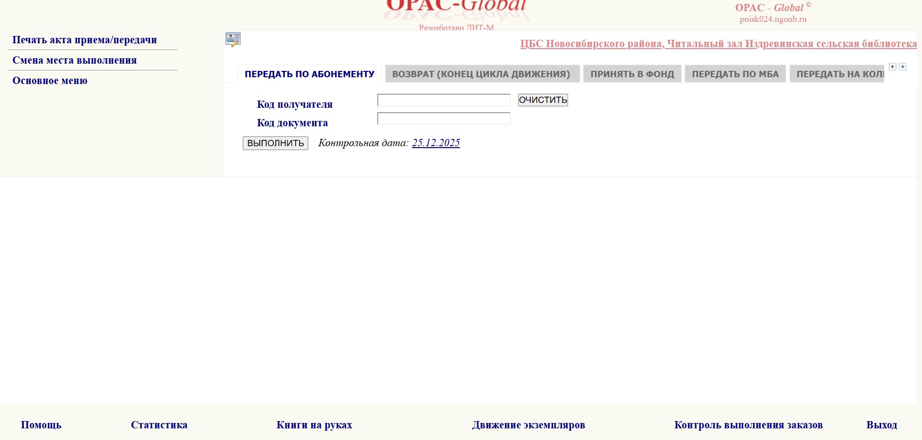 | 0000524 | Вопросы по АБИС Opac-Global НСО | Проблема | public | 2025-11-25 07:34 | 2025-11-26 10:17 |