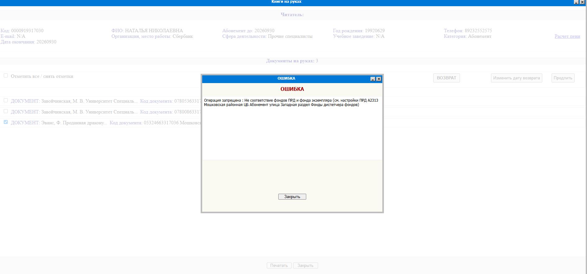 Не списывается, т.к. выдана книга из другого фонда, и возврат, конечно, не пройдет на этот ПРД. Например, выдан 07805363317036: 899 ##$aМошковская ЦБС$b19Отдел обслуживания 23$cАБОНЕМЕНТ$h84(2=411.2)6$iЗ-13$mЭКСМО$p07805363317036 ПРД для ЗАПАДНОЙ обслуживает только книги соответствующие. Если были выданы книги из другого фонда на этом ПРД, то надо "ПРИНЯТЬ ОТ ЧИТАТЕЛЯ", а потом отправить на ПРД соответствующего фонда. Если надо, чтобы на ПРД ЗАПАДНАЯ выдавались/возвращались книги из других фондов, то напишите, какие фонды подключить для возможности прямого возврата на этом ПРД. |