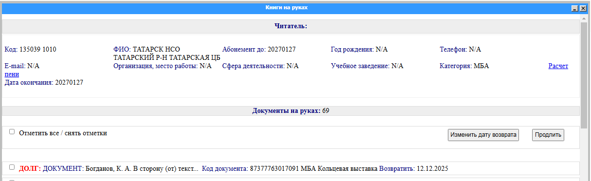 Проверяйте свои книги по номеру читательского билета, на который получаете книги в НГОНБ. Этот номер напечатан на сопроводительном документе при получении книг в НГОНБ. Номер читательского билета вашей библиотеки: 135039 1010. В Циркуляции раздел "Книги на руках" можете смотреть документы, которые находятся у вас на руках, см. вложенные рис. |
