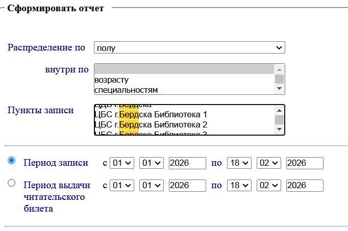 В задаче уточняйте, пожалуйста, название ЦБС и название библиотек №1, №2, №3, №4, №5. В каждой из этих библиотек, пункт записи единственный, и он открывается автоматически при записи читателей в этих библиотеках. Можно проверить записанных читателей в отчетах АБИС, см. рис. |