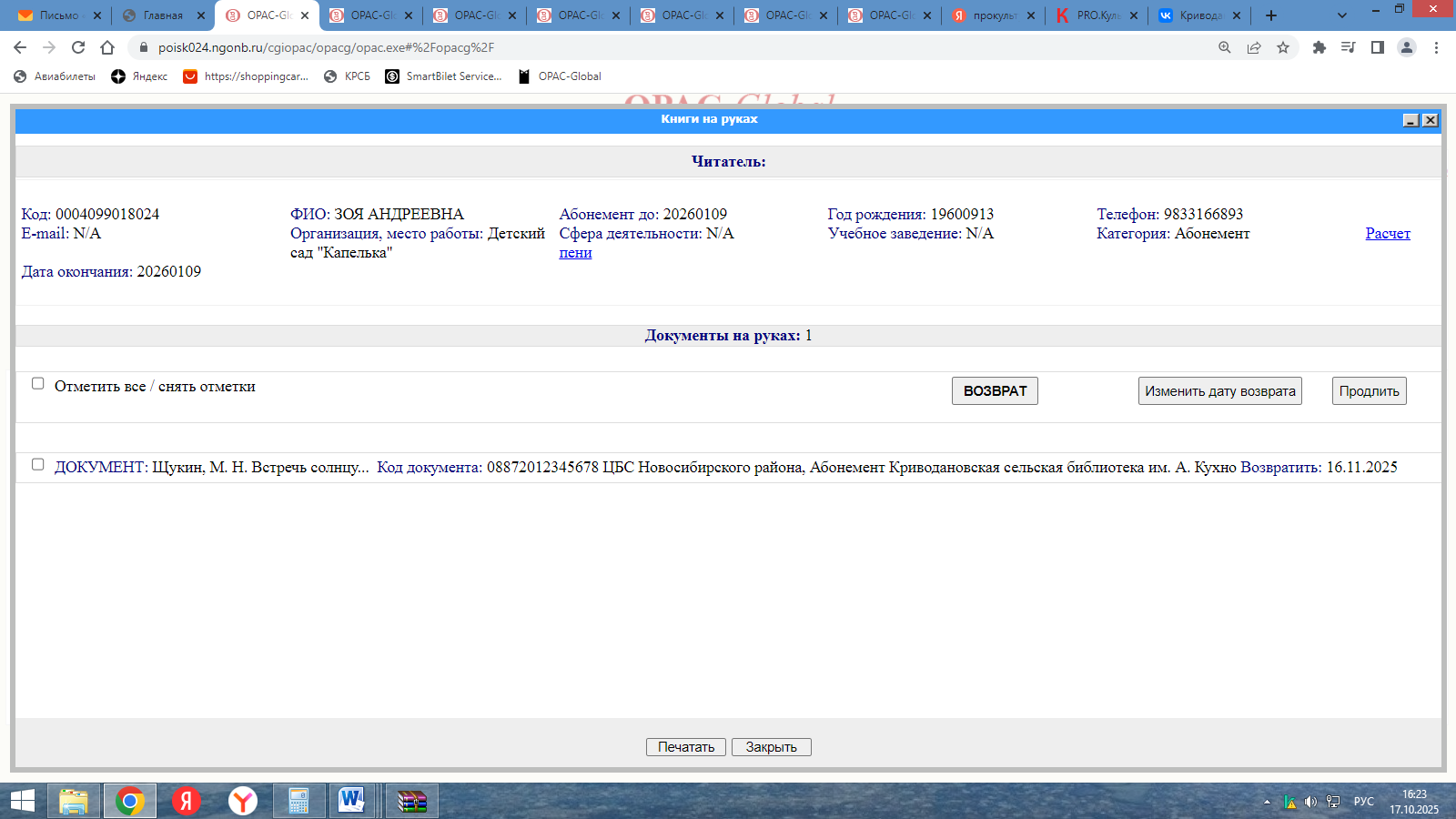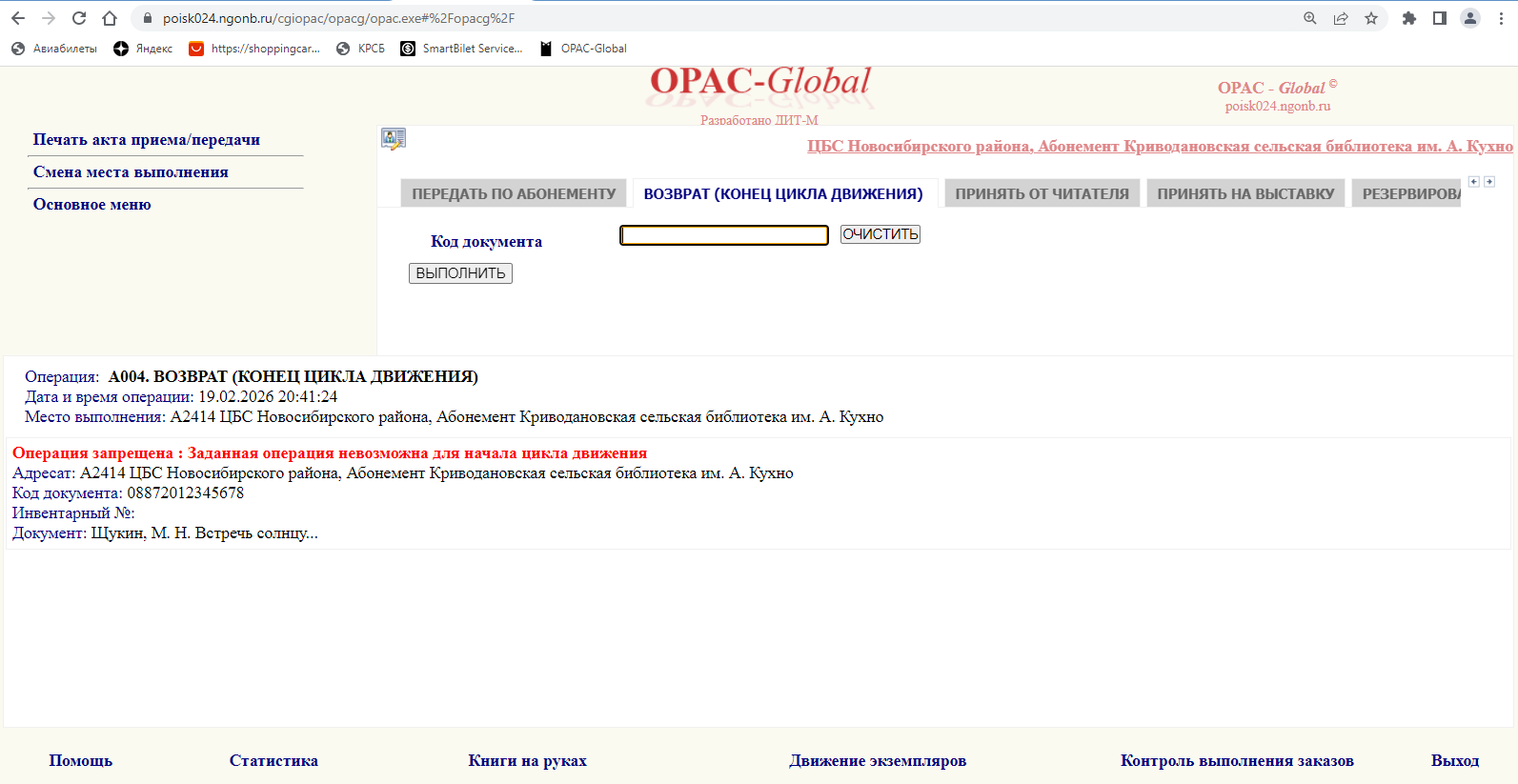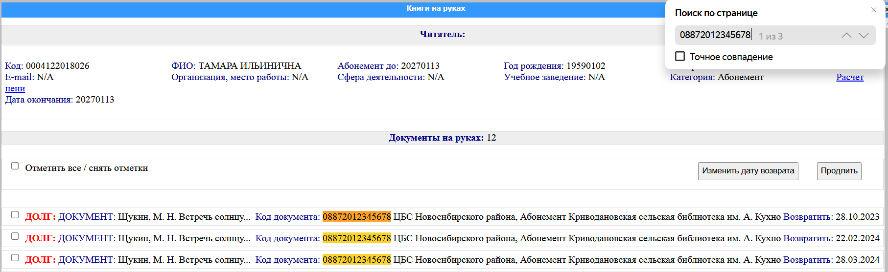 DescriptionЗдравствуйте. В Криводановской модельной сельской библиотеке им. А. Кухно (МКУ Новосибирского района "ЦБС") книга М. Щукина "Встречь солнцу" штрихкод 08872012345678 не списывается с программы ОРАС. Всем выдается и ни у кого не списывается. Например она Выдана Зое Андреевне (штрихкод читательского билета 0004099018024). Помогите, пожалуйста, решить данную проблему.