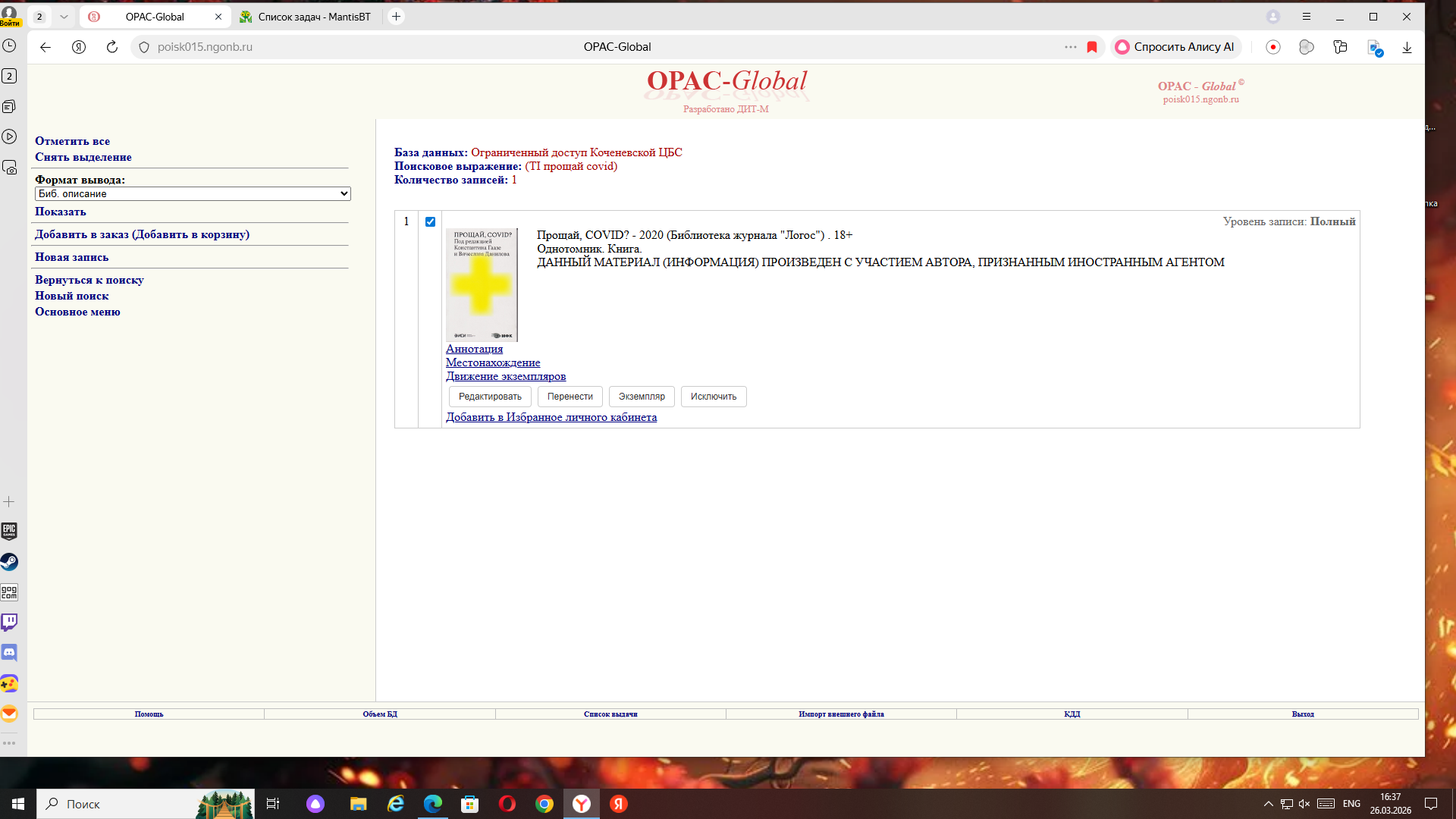 | Description | Здравствуйте. 23.03.2026 книга 78304 Прощай, COVID? - 2020 (Библиотека журнала "Логос") . 18+ была перенесена в базу Ограниченный доступ. В базе СК НСО книги, ноты мультимедиа данная книга осталась без отметки ДАННЫЙ МАТЕРИАЛ (ИНФОРМАЦИЯ) ПРОИЗВЕДЕН С УЧАСТИЕМ АВТОРА, ПРИЗНАННЫМ ИНОСТРАННЫМ АГЕНТОМ. В чем может быть причина? | ||||