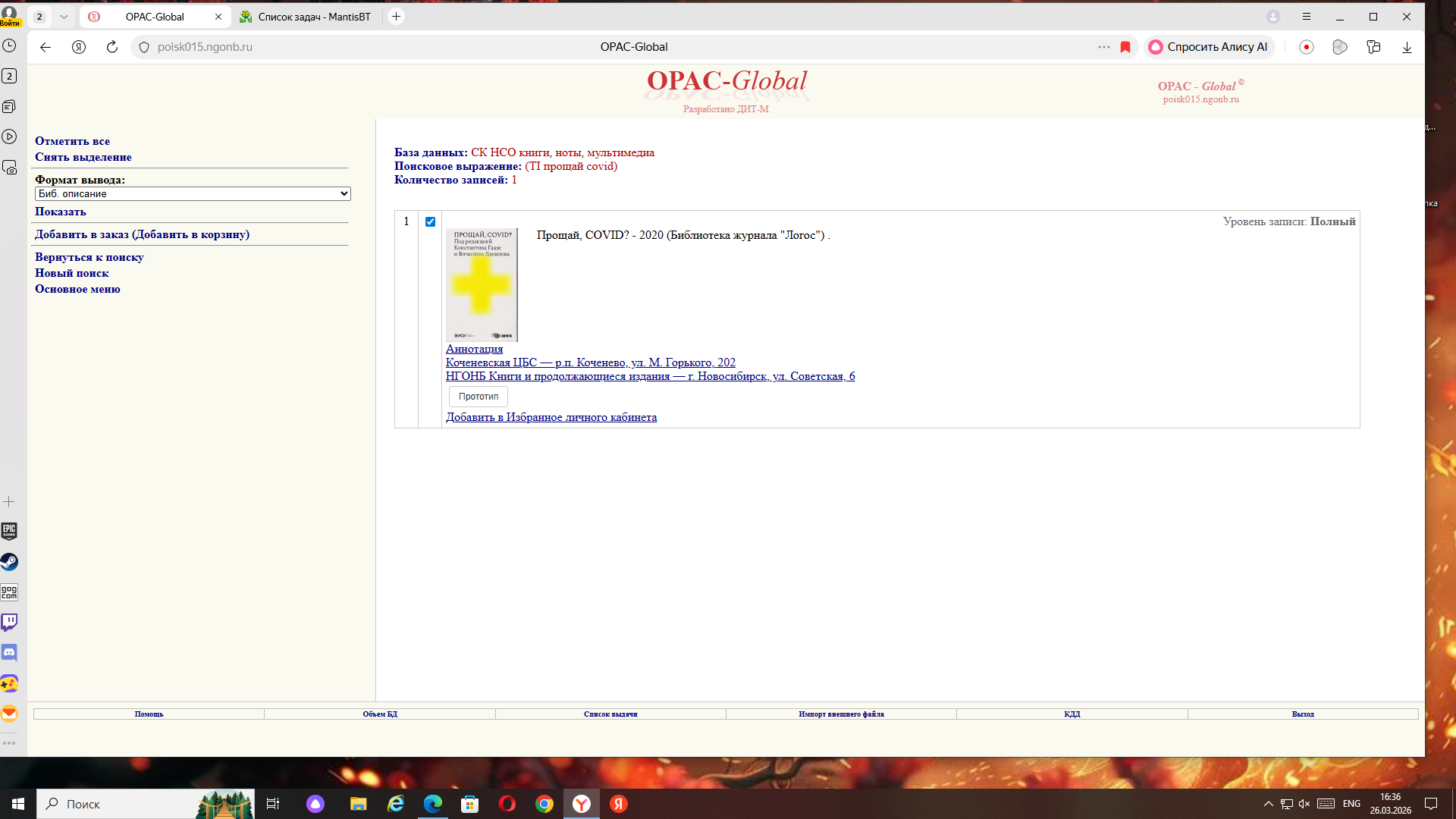 | 0000740 | Вопросы по АБИС Opac-Global НСО | Проблема | public | 2026-03-26 09:42 | 2026-03-26 11:12 |