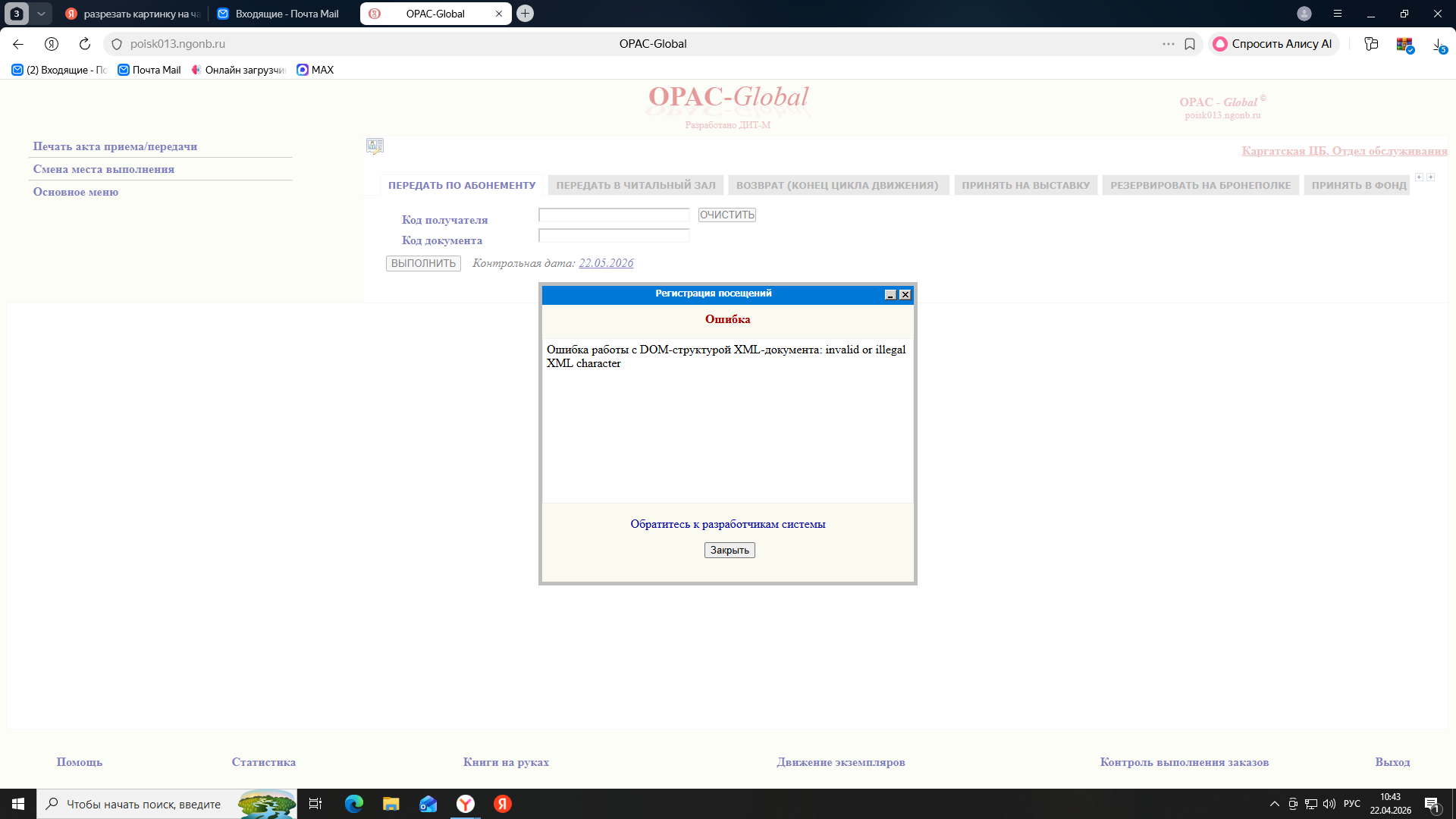| 0000777 | Вопросы по АБИС Opac-Global НСО | Проблема | public | 2026-04-22 03:51 | 2026-04-22 03:56 |
